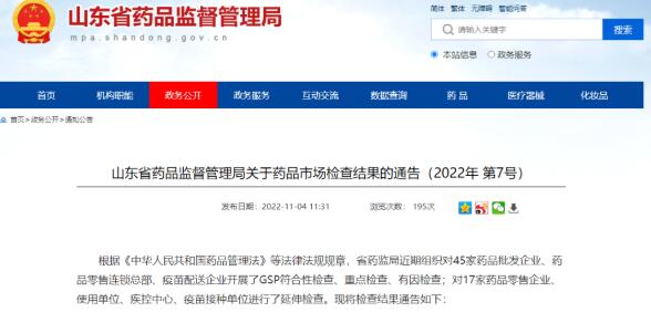 山東省藥品監(jiān)督管理局近期組織對45家藥品批發(fā)企業(yè)、藥品零售連鎖總部、疫苗配送企業(yè)開展了GSP符合性檢查、重點檢查、有因檢查;對17家藥品零售企業(yè)、使用單位、疾控中心、疫苗接種單位進行了延伸檢查。