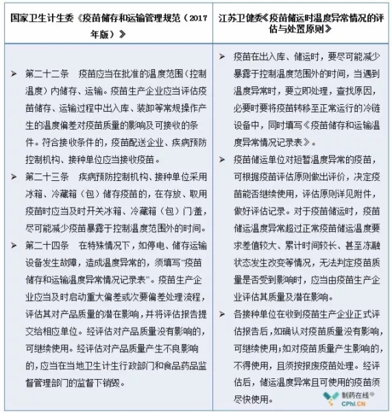 疫苗,關(guān)系人民群眾生命健康,關(guān)系公共衛(wèi)生安全和國(guó)家安全,是國(guó)家戰(zhàn)略性、公益性產(chǎn)品。自2005年3月24日《疫苗流通和預(yù)防接種管理?xiàng)l例》首部疫苗相關(guān)政策發(fā)布以來(lái),對(duì)疫苗儲(chǔ)運(yùn)時(shí)溫度異常情況的評(píng)估與處置原則沒(méi)有形成相對(duì)完善的科學(xué)處置方案。2017年12月15日,國(guó)家衛(wèi)生計(jì)生委、食品藥品監(jiān)管總局對(duì)2006《疫苗儲(chǔ)存和運(yùn)輸管理規(guī)范》進(jìn)行了修訂,形成了《疫苗儲(chǔ)存和運(yùn)輸管理規(guī)范(2017年版)》,首次要求加強(qiáng)疫苗儲(chǔ)存運(yùn)輸中溫度異常的管理,提出處理溫度異常疫苗的原則要求,但無(wú)具體的處理措施,江蘇衛(wèi)健委在《疫苗儲(chǔ)存和運(yùn)輸管理規(guī)范(2017年版)》提出了更具有可操作性的科學(xué)處置溫度異常疫苗的處理措施。